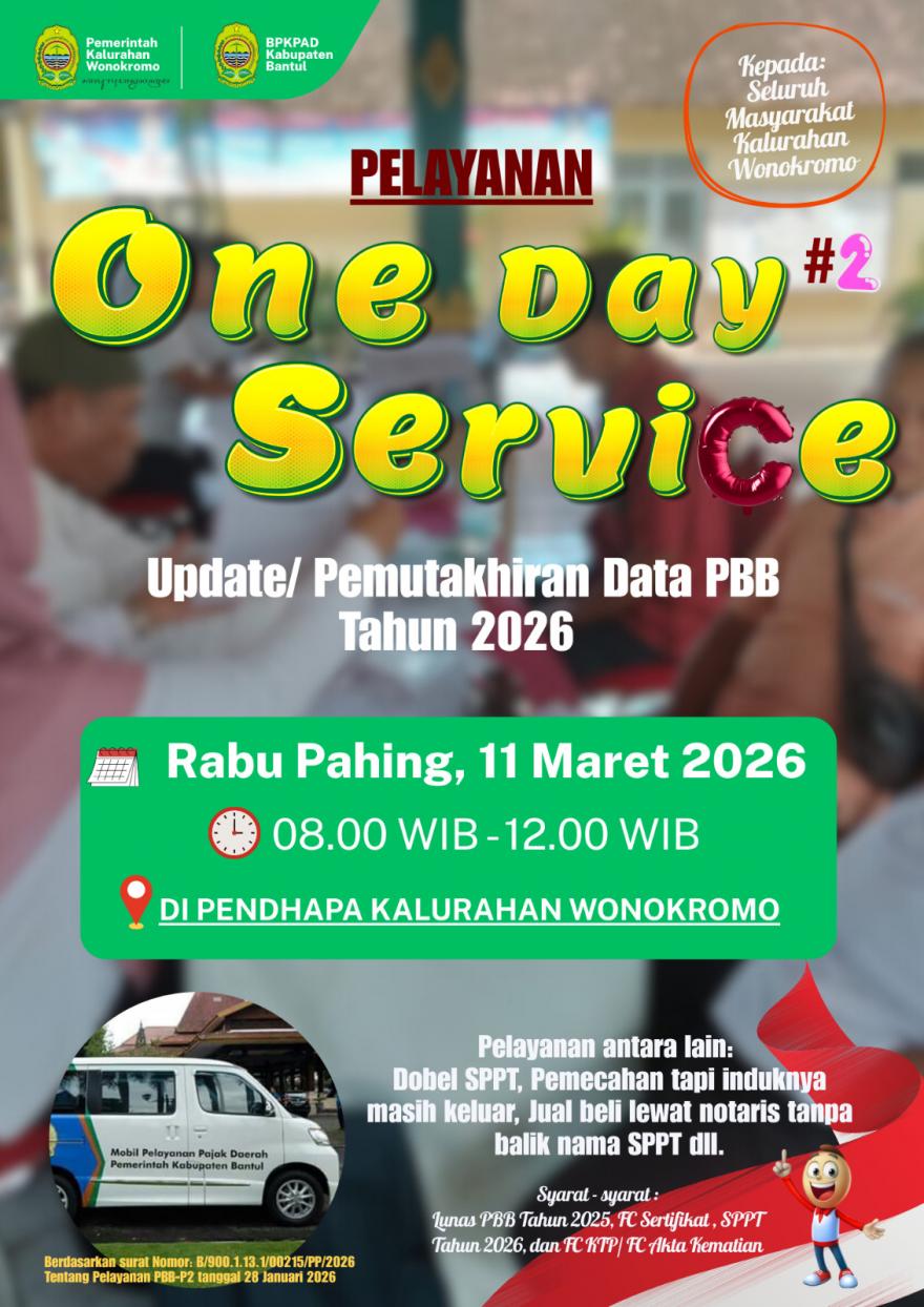 Kegiatan pelayanan ini dilaksanakan pada Rabu Pahing, 11 Maret 2026 mulai pukul 08.00 WIB sampai dengan 12.00 WIB, bertempat di Pendhapa Kalurahan Wonokromo. Program ini bertujuan untuk memberikan kemudahan bagi masyarakat dalam melakukan pemutakhiran data Pajak Bumi dan Bangunan Perdesaan dan Perkotaan (PBB-P2) secara cepat dan langsung dalam satu hari pelayanan.
