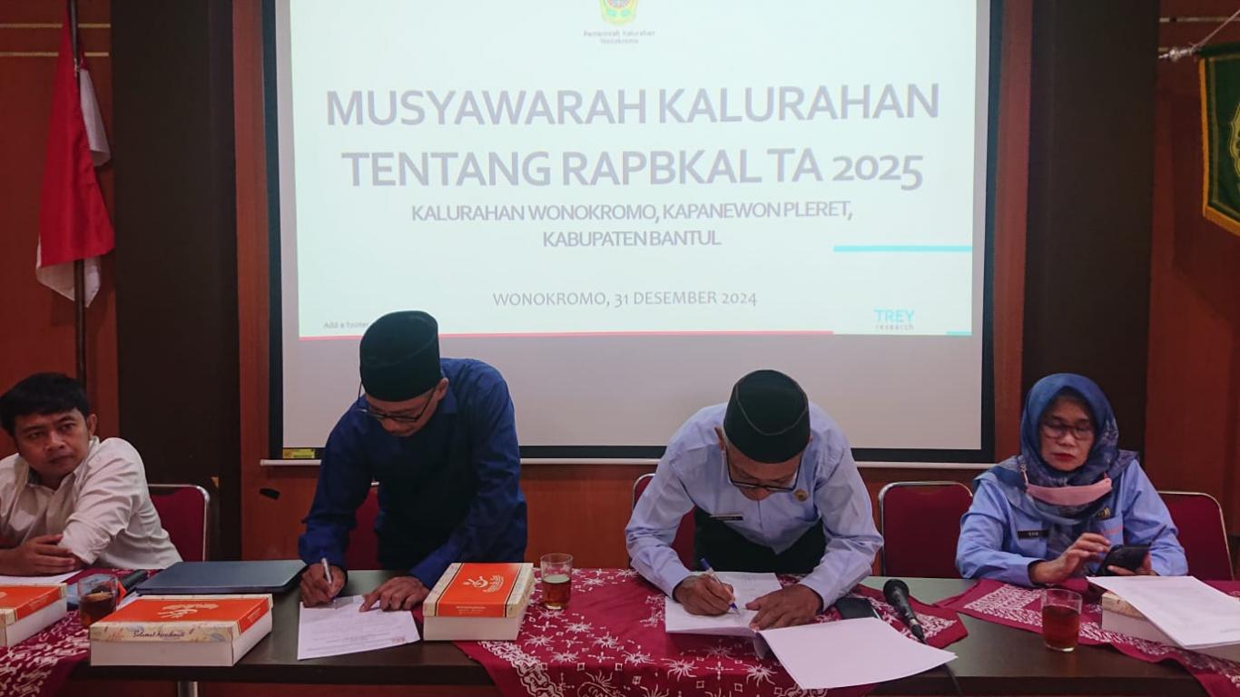Selasa, 31 Desember 2024. Pemerintah Kalurahan Wonokromo bersama Bamuskal Wonokromo telah melaksanakan agenda tahunan yakni Pembahasan dan Penetapan APBKal Tahun Anggaran 2025. Acara tersebut dilaksanakan di Ruang Rapat kalurahan Wonokromo dengan dihadiri oleh Pemkal Wonokromo, Bamuskal Wonokromo, dan Perwakilan Lembaga Kalurahan Wonokromo, Babhinsa, Babhinkamtibmas, dan Kaanewon Pleret.